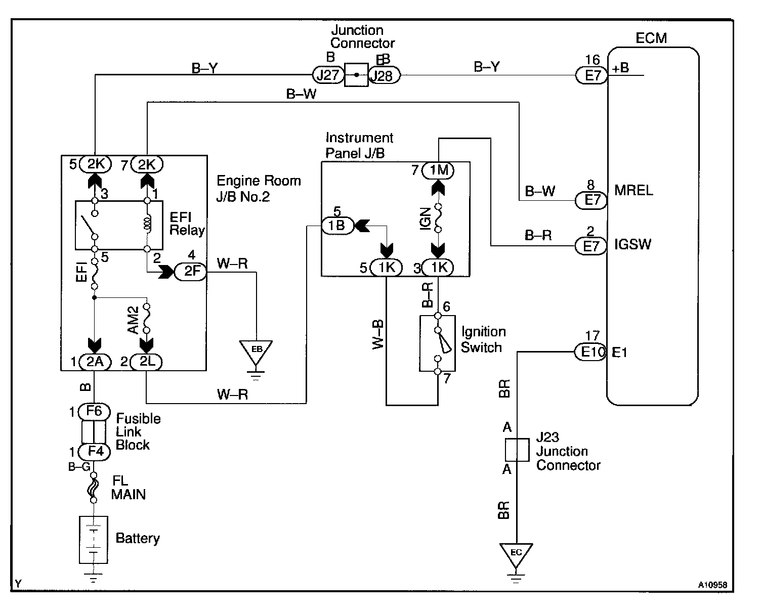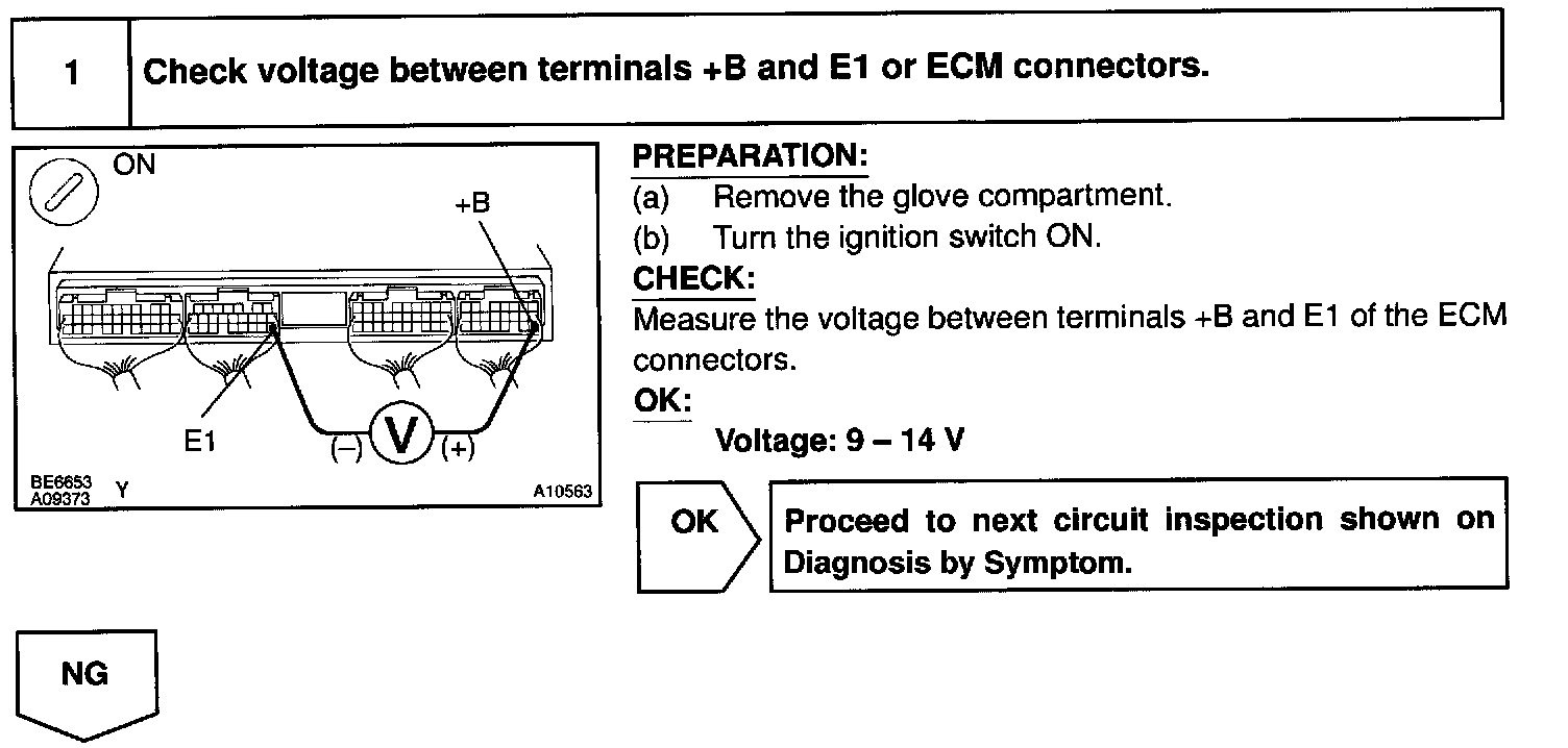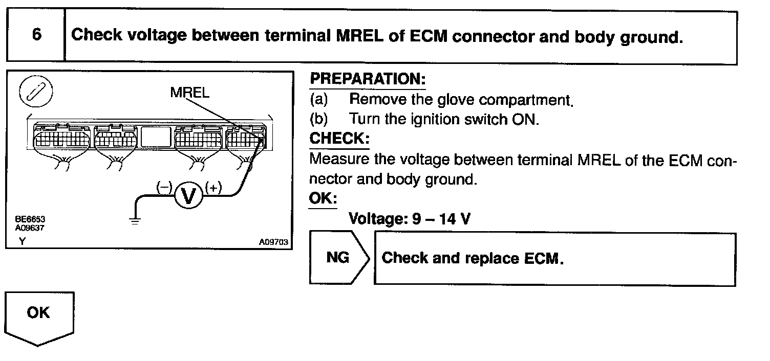 This signal causes current to flow to the coil, closing the contacts of the EFI, main relay and supplying power to terminals +B of the ECM.