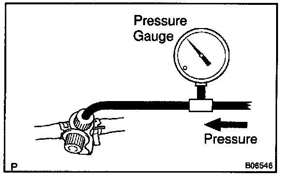 a. Disconnect the EVAP line hose from the charcoal canister side and then pressurize and make the internal pressure in the fuel tank 4 kPa (41 gf/sq.cm, 0.58 psi).