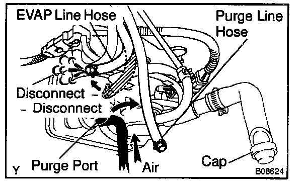 a. Disconnect the purge line hose and EVAP line hose from the charcoal canister.
