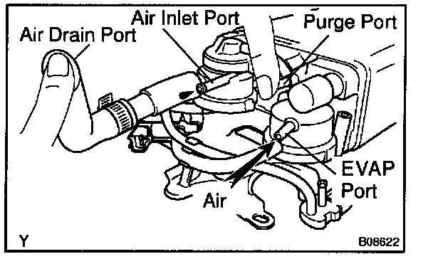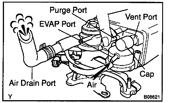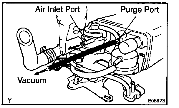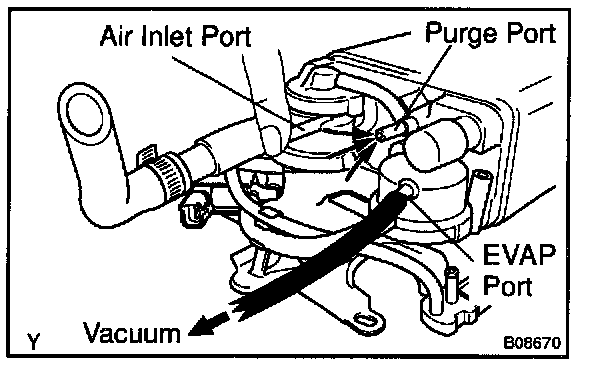 5. While holding the air inlet port closed, apply vacuum (3.43 kPa, 25.7 mm Hg, 1.01 in.Hg) to the EVAP port and check that air flows into the purge port.
