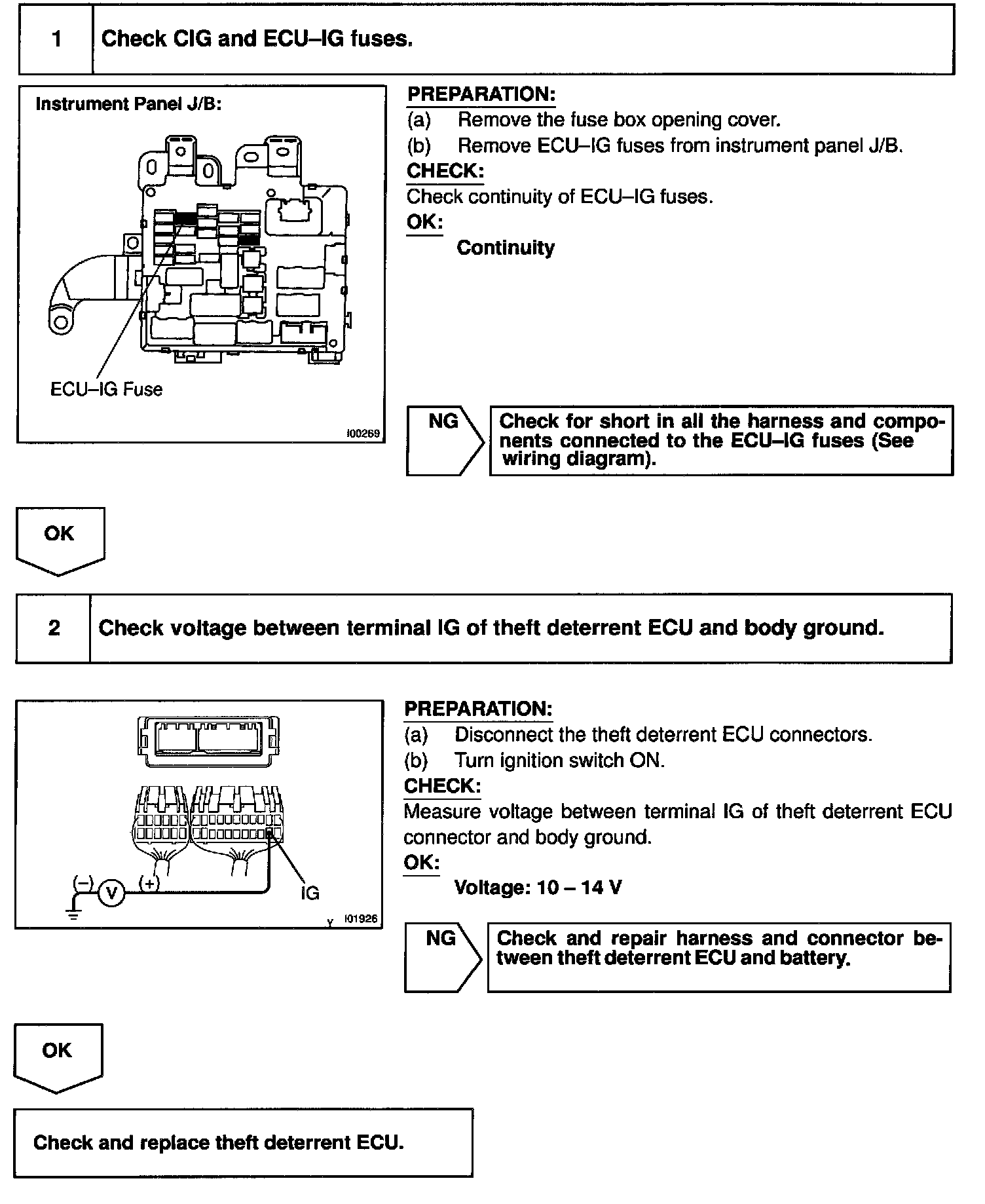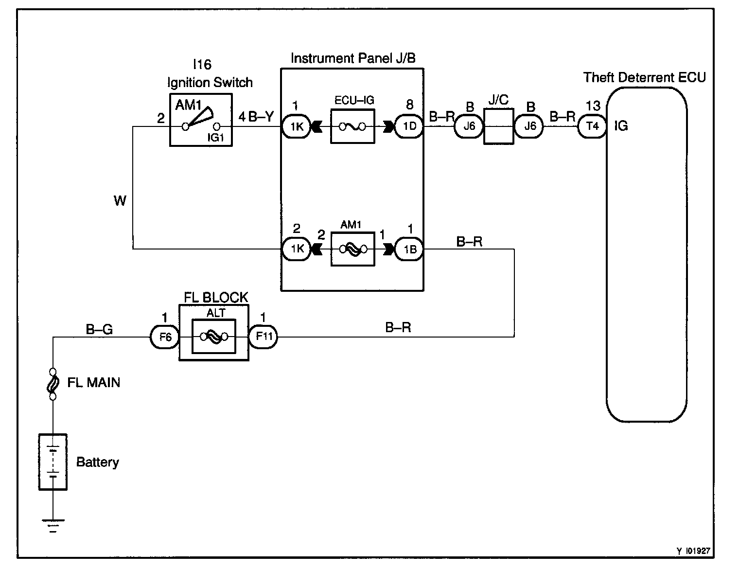 When the ignition switch is turned to the ACC position, battery positive voltage is applied to the terminal ACC of the ECU. Also, if the ignition switch is turned to the ON position, battery positive voltage is applied to the terminals ACC and IG of the ECU. When the battery positive voltage is applied to the terminal ACC of the ECU while the theft deterrent system is activated, the warning stops. Furthermore, power supplied from the terminals ACC and IG of the ECU is used as power for the door courtesy switch, and position switch, etc.