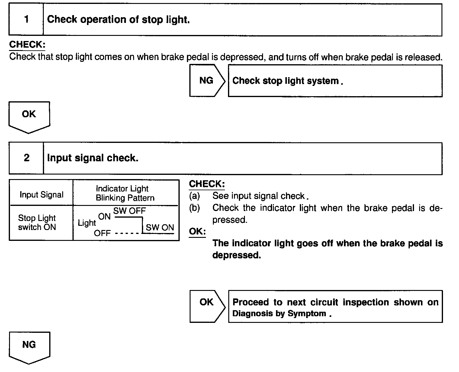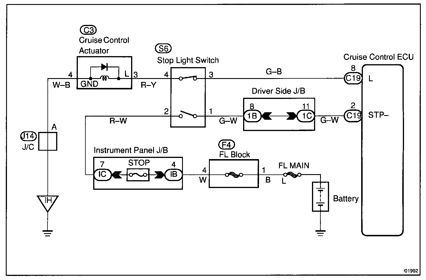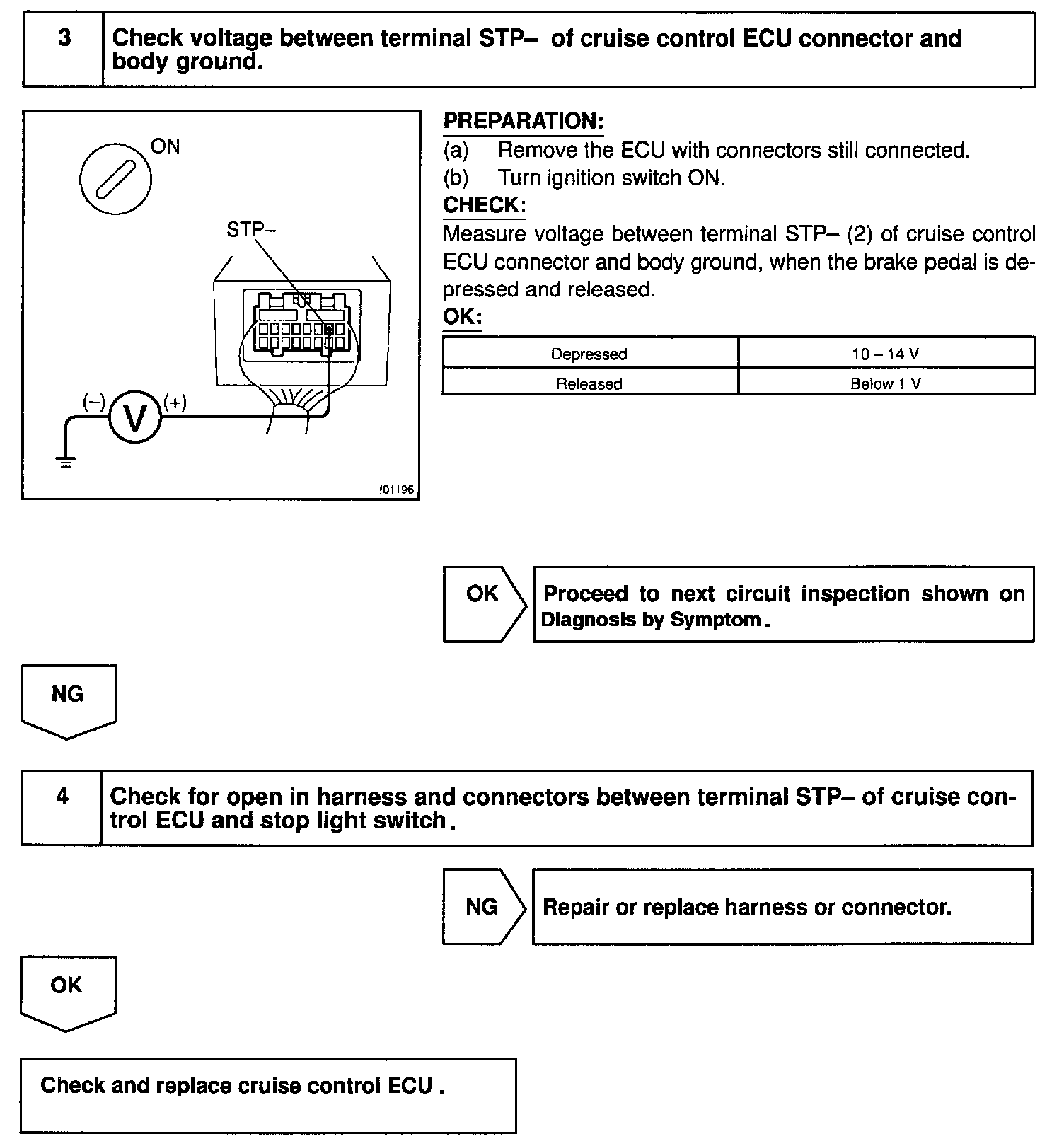 The cancel conditions are: Battery positive voltage at terminal STP - When the brake is on, battery positive voltage normally applies through the STOP fuse and stop light switch to terminal STP- of the ECU, and the ECU turns the cruise control off. If the harness connected to terminal STP - has an open circuit, terminal STP- will have battery positive voltage and the cruise control will be turned off.