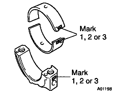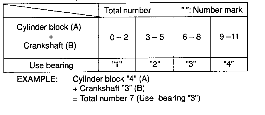 HINT: If using a standard bearing, replace it with one having the same number. If the number of the bearing cannot be determined, select the correct bearing by adding together the numbers imprinted on the cylinder block and crankshaft, then selecting the bearing with the same number as the total. There are 4 sizes of standard bearings, marked "1", "2", "3", and "4" accordingly.