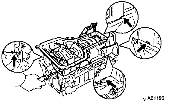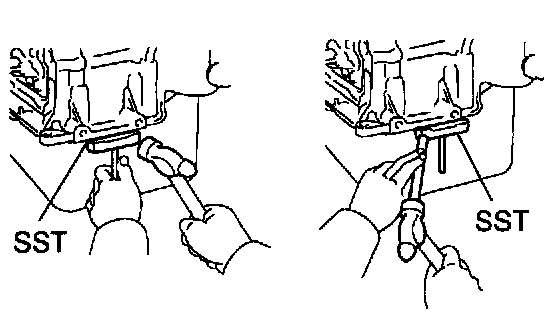 b. Insert the blade of Special Service Tool (SST) between the bearing cap sub-assembly and oil pan, and cut off applied sealer and remove the oil pan.