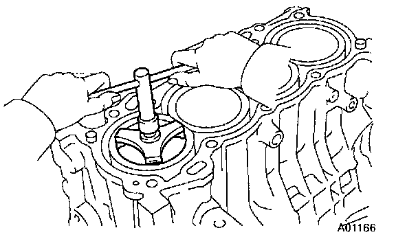 b. Push the piston, connecting rod assembly and upper bearing through the top of the cylinder block.