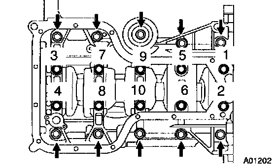 b. Uniformly loosen and remove the 10 bearing cap sub-assembly bolts, in several passes, in the sequence shown.