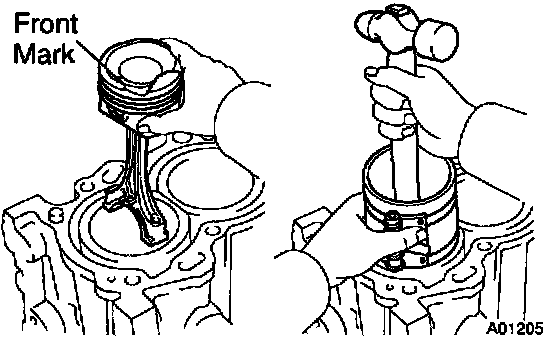 Using a piston ring compressor, push the correctly numbered piston and connecting rod assemblies into each cylinder with the front mark of the piston facing forward.