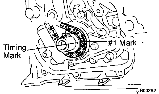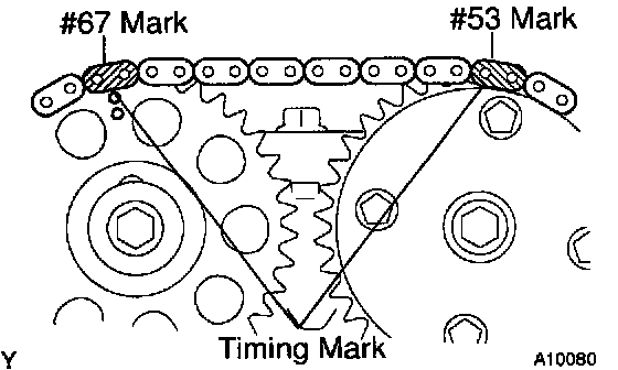 b. Check that the point marks of the camshaft timing sprockets are in straight line on the timing chain cover surface as shown in the illustration.