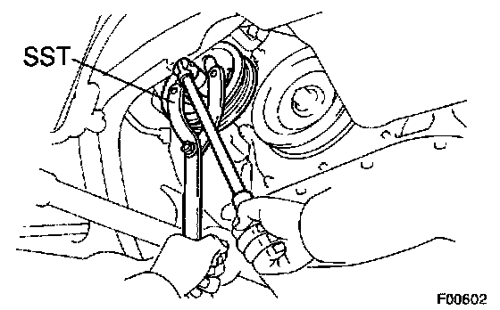 c. Using SST and 2 nuts (width: 10 mm (0.25 inch), install the pulley bolt.