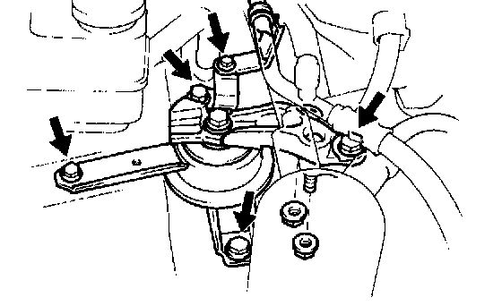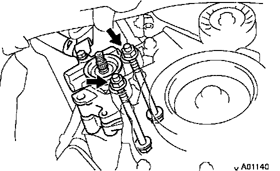 d. Remove the 2 nuts and through bolts, and disconnect the PS pump from the engine.