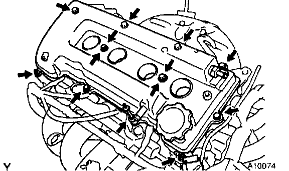 f. Remove the 9 bolts, 2 seal washers, 2 nuts, cable bracket, cylinder head cover and gasket.