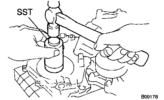 2. Using Special Service Tool (SST) and a hammer, tap in a new oil seal until its surface is flush with the timing chain cover edge.