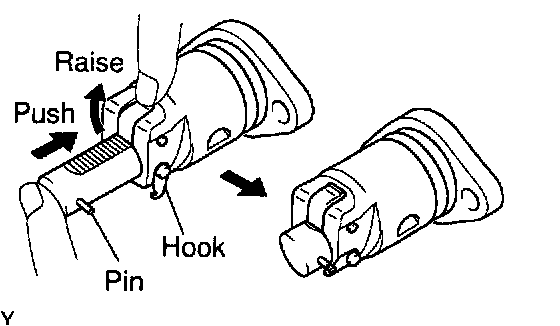 b. Release the ratchet pawl, fully push in the plunger and apply the hook to the pin so that the plunger cannot spring out.