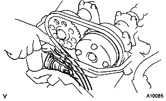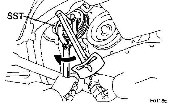 c. Hook the tool on the hexagonal portion of the drive belt tensioner bracket and operate drive belt tensioner 3 times with full stroke.