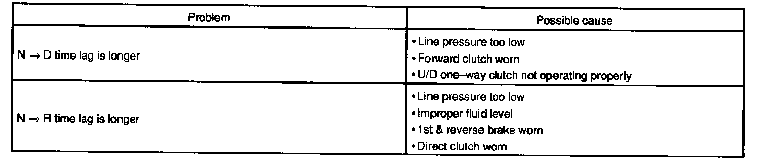 When the shift lever is shifted while the engine is idling, there will be a certain time of lapse or lag before the shock can be felt. This is used for checking the condition of the O/D direct clutch, forward clutch, direct clutch, and 1st & reverse brake.