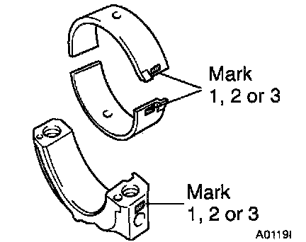 HINT: If replacing a bearing, replace it with one having the same number as marked on the connecting rod. There are 3 sizes of standard bearings, marked "1", "2" and "3" accordingly.