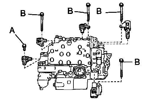 Install the 5 shift solenoid valves with the 5 bolts.
