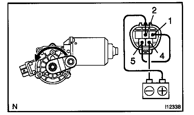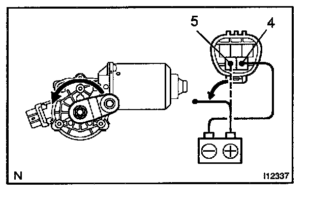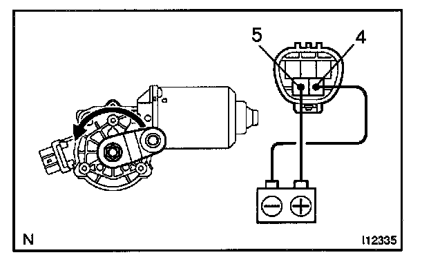 Connect the positive (+) lead from the battery to terminal 5 and the negative (-) lead to terminal 4, check that the motor operates at low speed.