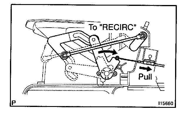 d. Adjust the air inlet damper control cable.Set the air inlet damper control lever to "RECIRC" position and connect the inner cable to lever pin and clamp the outer cable.