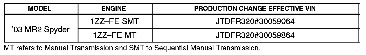 ^ 2000 - 2003 model year MR2 Spyder vehicles produced BEFORE the Production Change Effective VINs shown below.