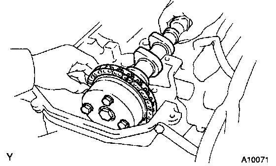 j) Hold the timing chain, and place the intake camshaft and timing sprocket assembly.