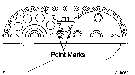 b) Check that the point marks of the camshaft timing sprocket and VVT timing sprocket are in straight line on the timing chain cover surface as shown in the illustration.