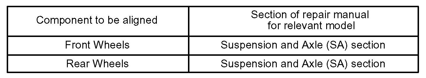 The drive train and chassis are components that can have great effects on the running performance and vibration resistance of the vehicle. After installing components in the sections listed in the table, perform alignments to ensure correct mounting angles and dimensions. Particularly accurate repair of the body must also be done to ensure correct alignment.