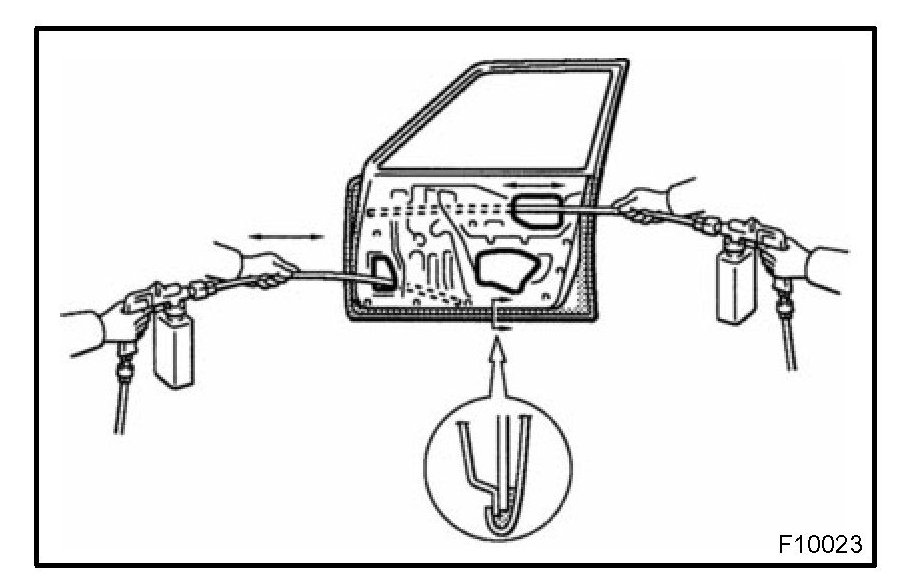 2. To preserve impossible to paint areas from corrosion, always apply sufficient anti-rust agent (wax) to the inside of the hemming areas of the doors and hoods, and around the hinges, or the welded surfaces inside the boxed cross-section structure of the side member, body pillar, etc.