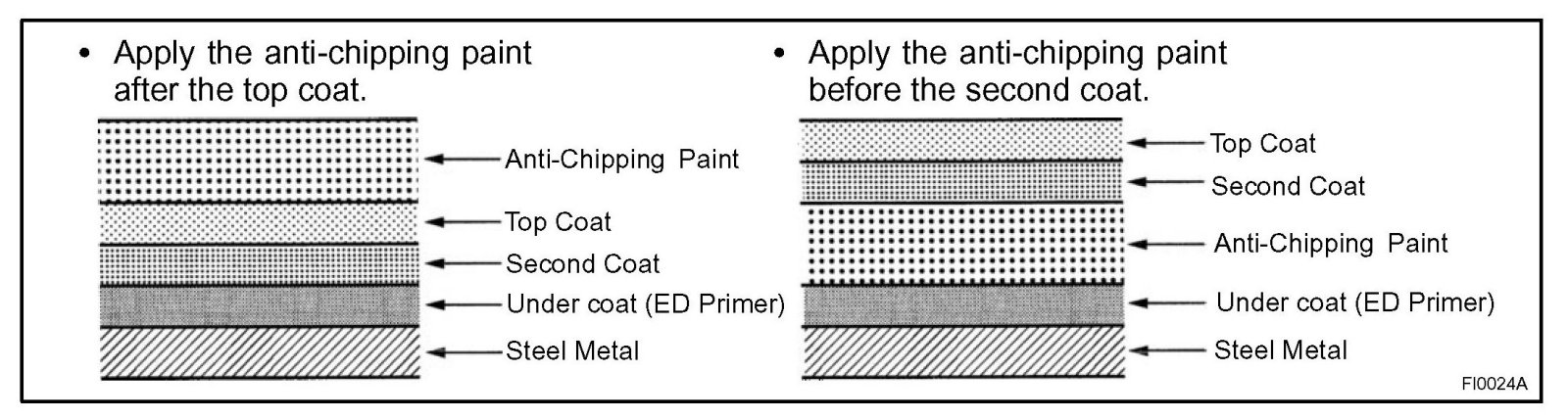 1. To prevent corrosion and protect the body from damage by flying stones, etc., apply anti-chipping paint to the rocker panel, wheel arch areas, valance panel, etc.