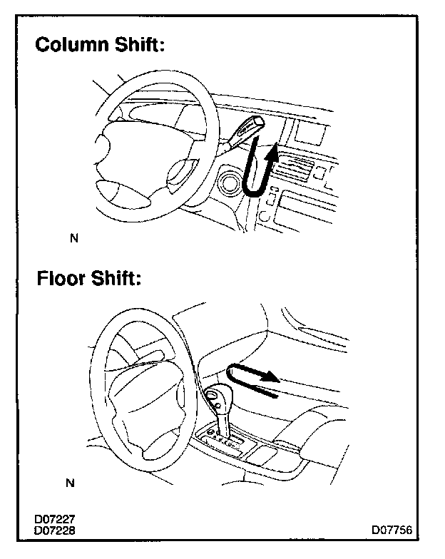 When shifting the shift lever from the N position to other positions, check that the lever can be shifted smoothly and accurately to each position and that the position indicator is aligned with the correct position.
