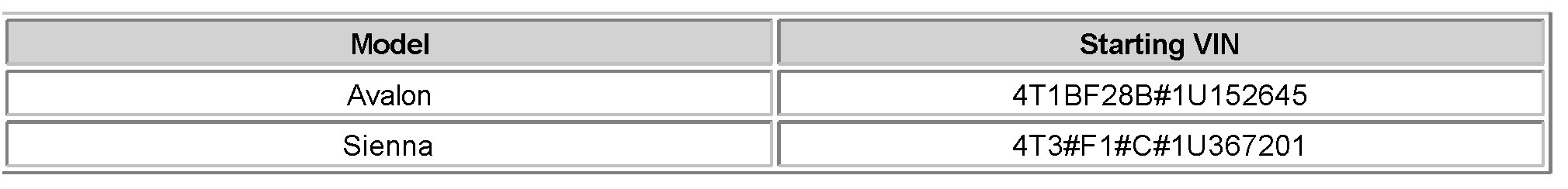 APPLICABLE VEHICLES: 2001 model year Avalon and Sienna vehicles.