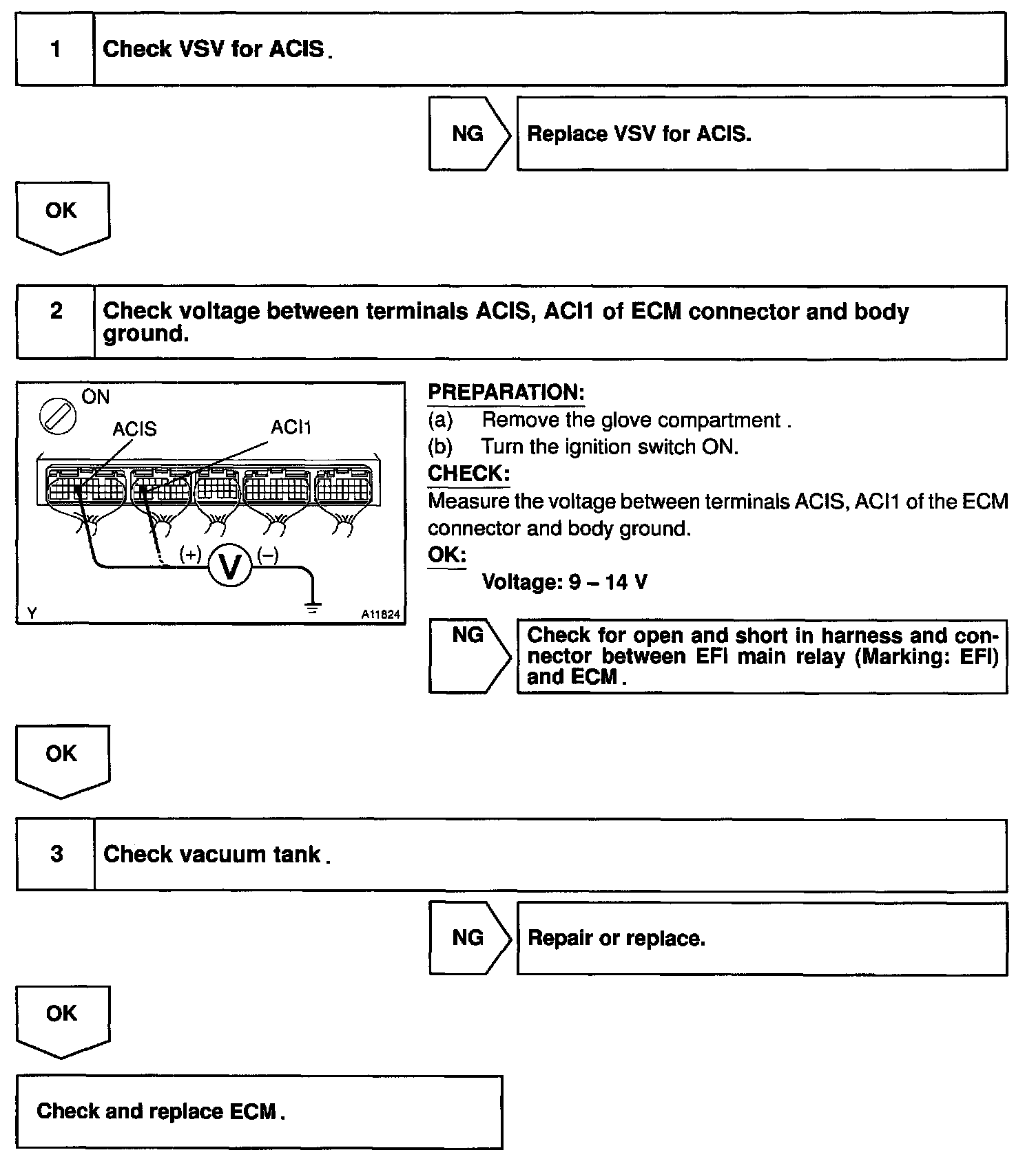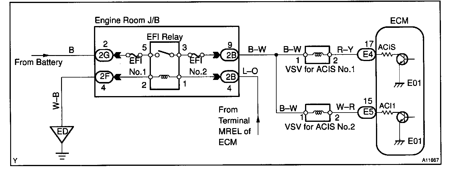 CIRCUIT DESCRIPTIONThis circuit opens and closes the IACV (Intake Air Control Valve) in response to the engine load in order to increase the intake efficiency (ACIS: Acoustic Control Induction System).