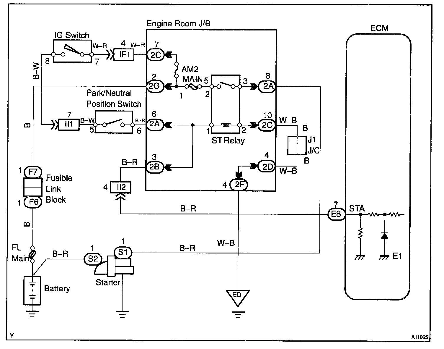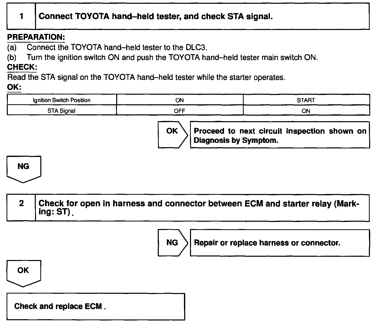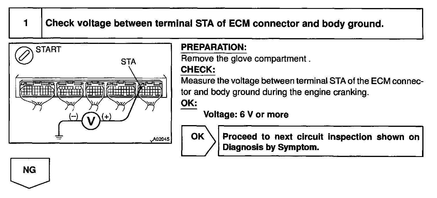 CIRCUIT DESCRIPTIONWhen the engine is cranked, the intake air flow is slow, so fuel vaporization is poor. A rich mixture is therefore necessary in order to achieve good startability. While the engine is being cranked, the battery positive voltage is applied to terminal STA of the ECM. The starter signal is mainly used to increase the fuel injection volume for the starting injection control and after-start injection control.