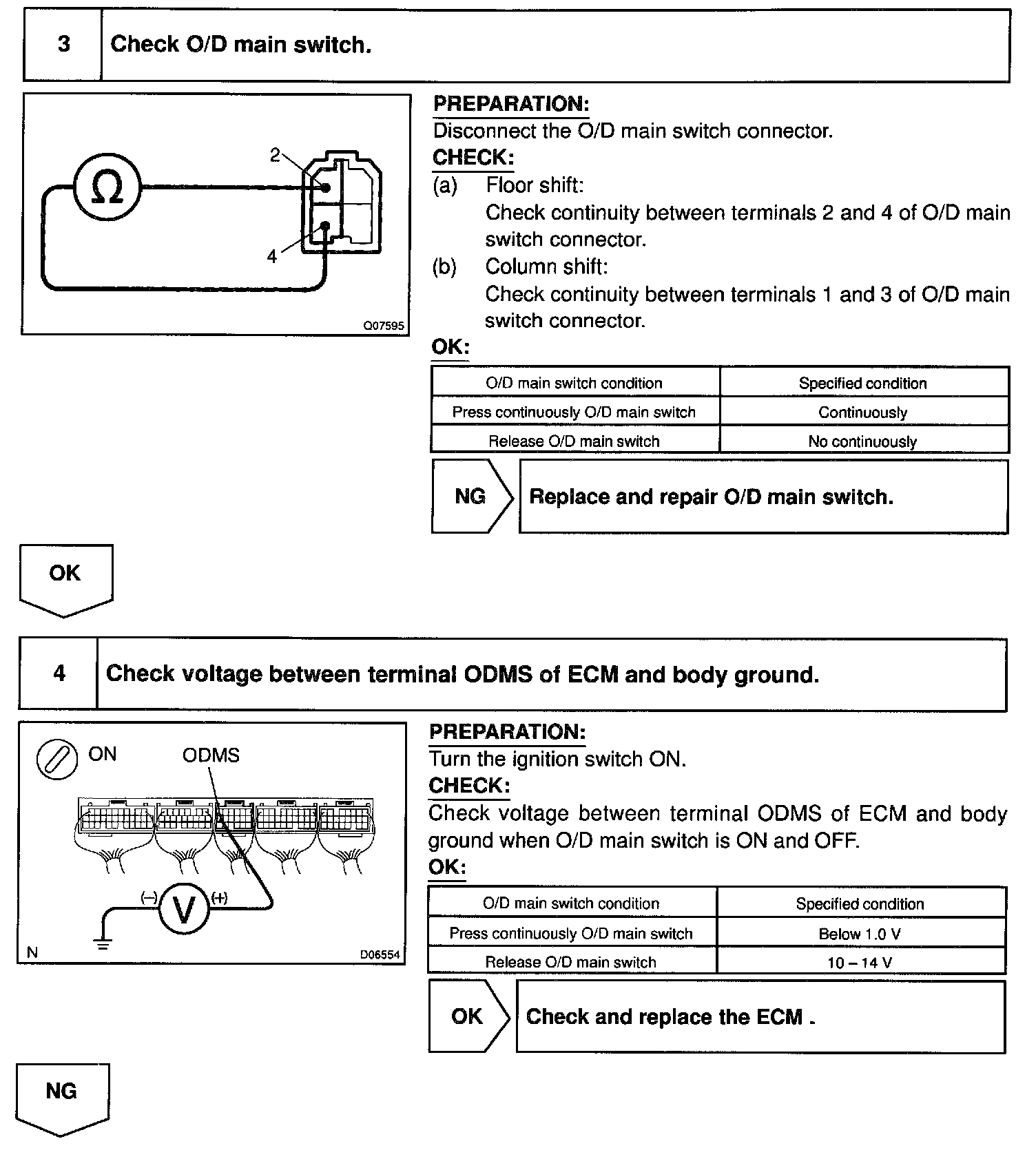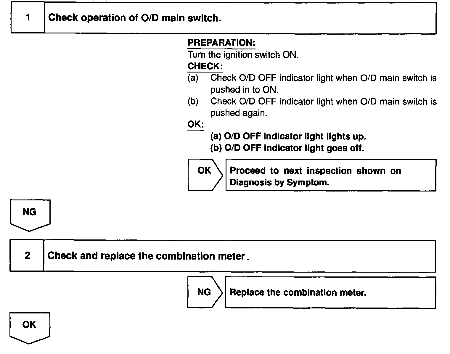 CIRCUIT DESCRIPTIONThe O/D main switch is a momentary type switch. When pressing the O/D OFF main switch, the O/D OFF indicator light lights up and ECM prohibits shifting to O/D, and when pressing it again, the O/D OFF indicator light goes off and ECM allows shifting to O/D. Turning the IG switch OFF will reset the O/D OFF indicator light.