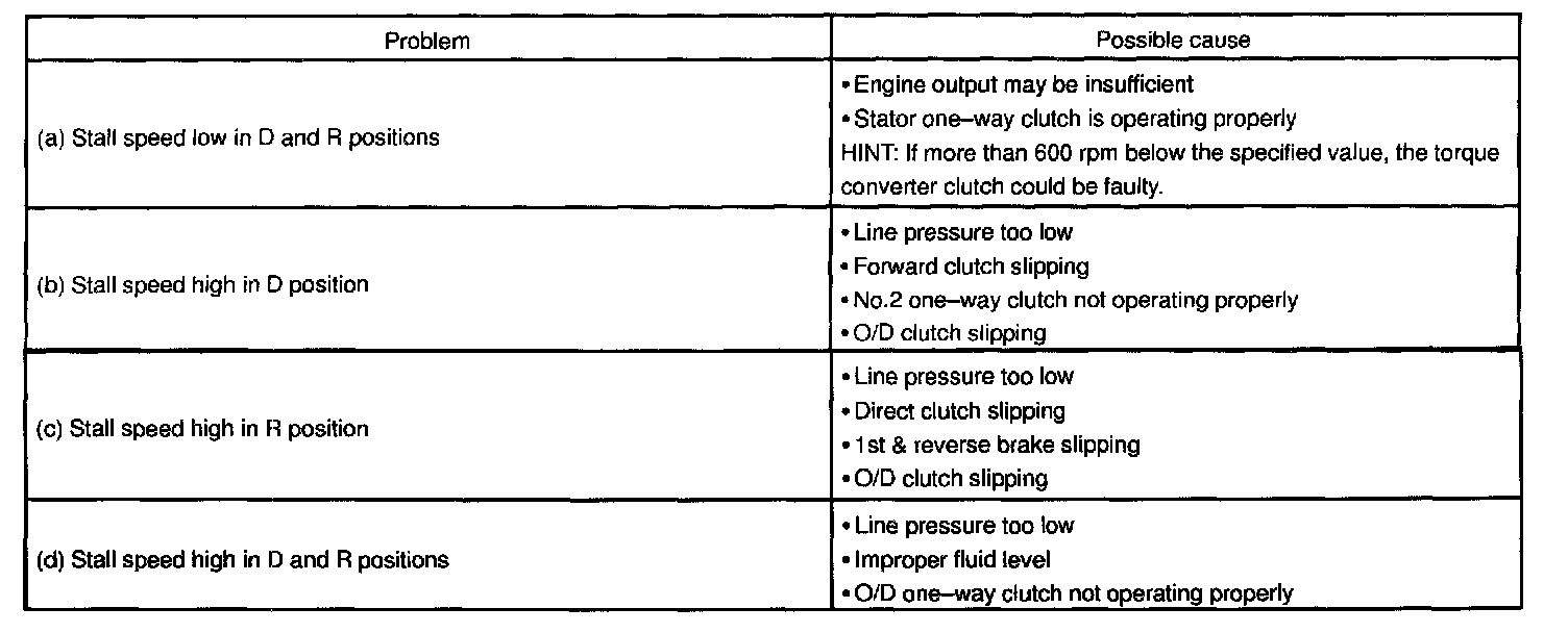 The object of this test is to check the overall performance of the transaxle and engine by measuring the stall speeds in the D and R positions.