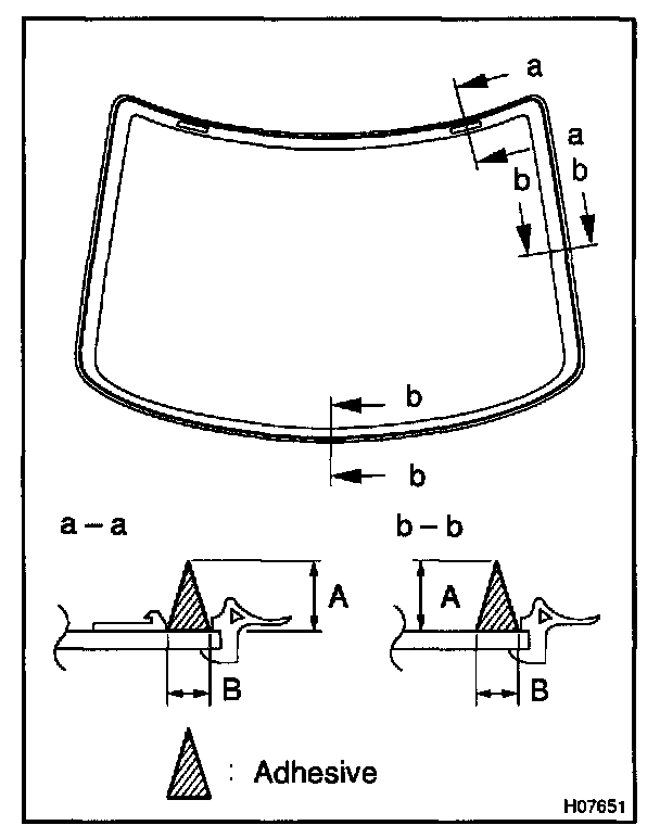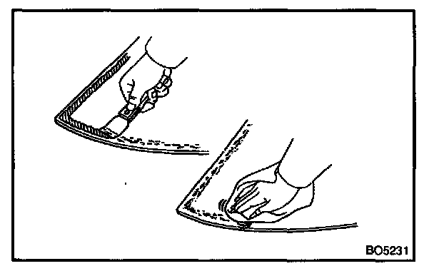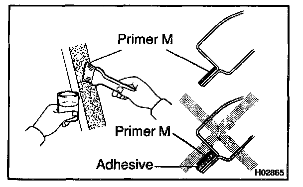 a. Using a brush or sponge, coat the edge of the glass and the contact surface with Primer G as shown in the illustration.