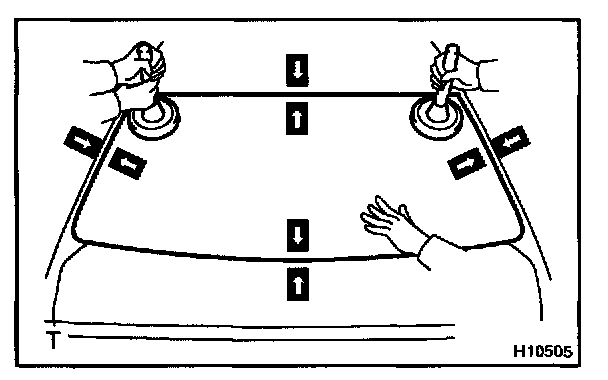 b. Hold the back window glass in place securely with a protective tape or equivalent until the adhesive hardens.