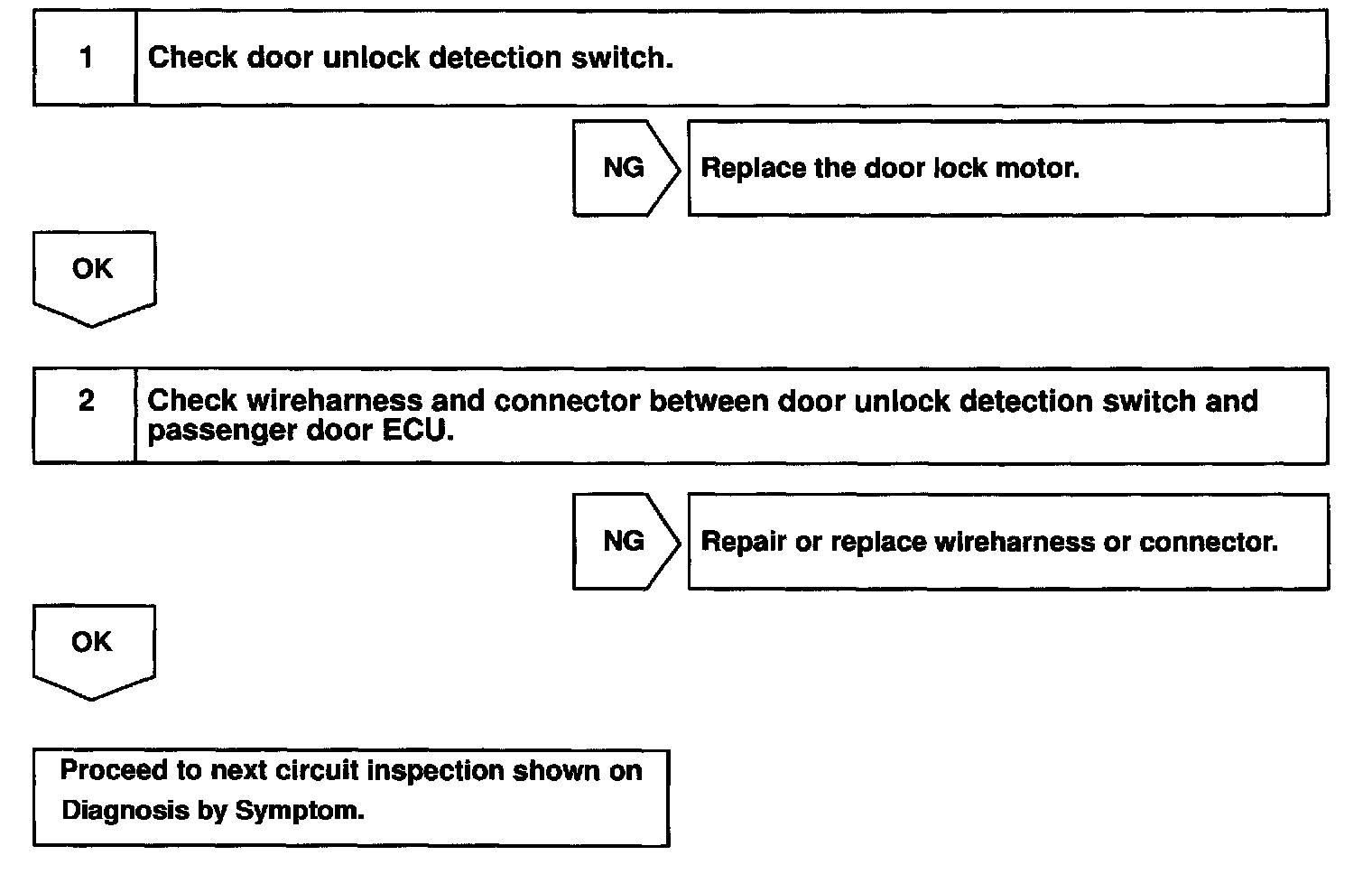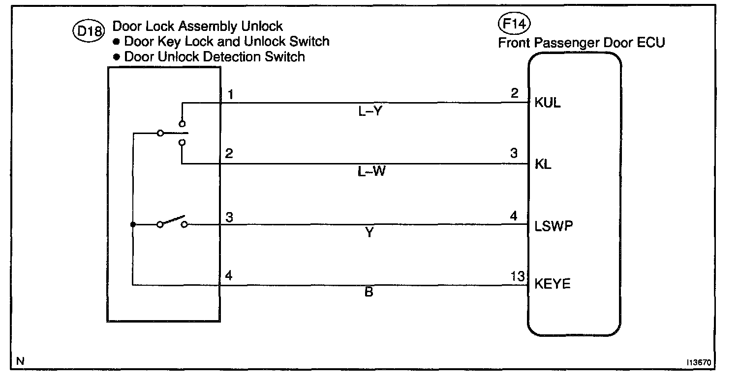 CIRCUIT DESCRIPTIONThe door unlock detection switch is built in the door lock motor assembly. This switch is ON when the door lock knob is in the unlock position and OFF when the lock knob is in the lock position. The ECU detects the door lock knob conditions is this circuit. It is used as one of the operating conditions for the key confinement prevention function.