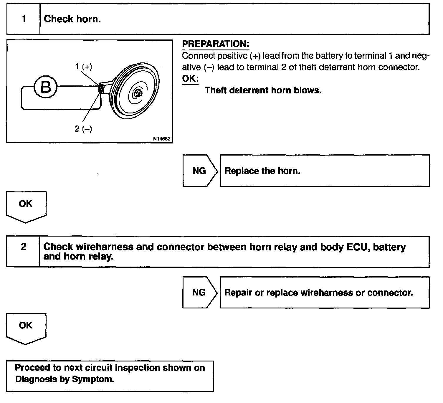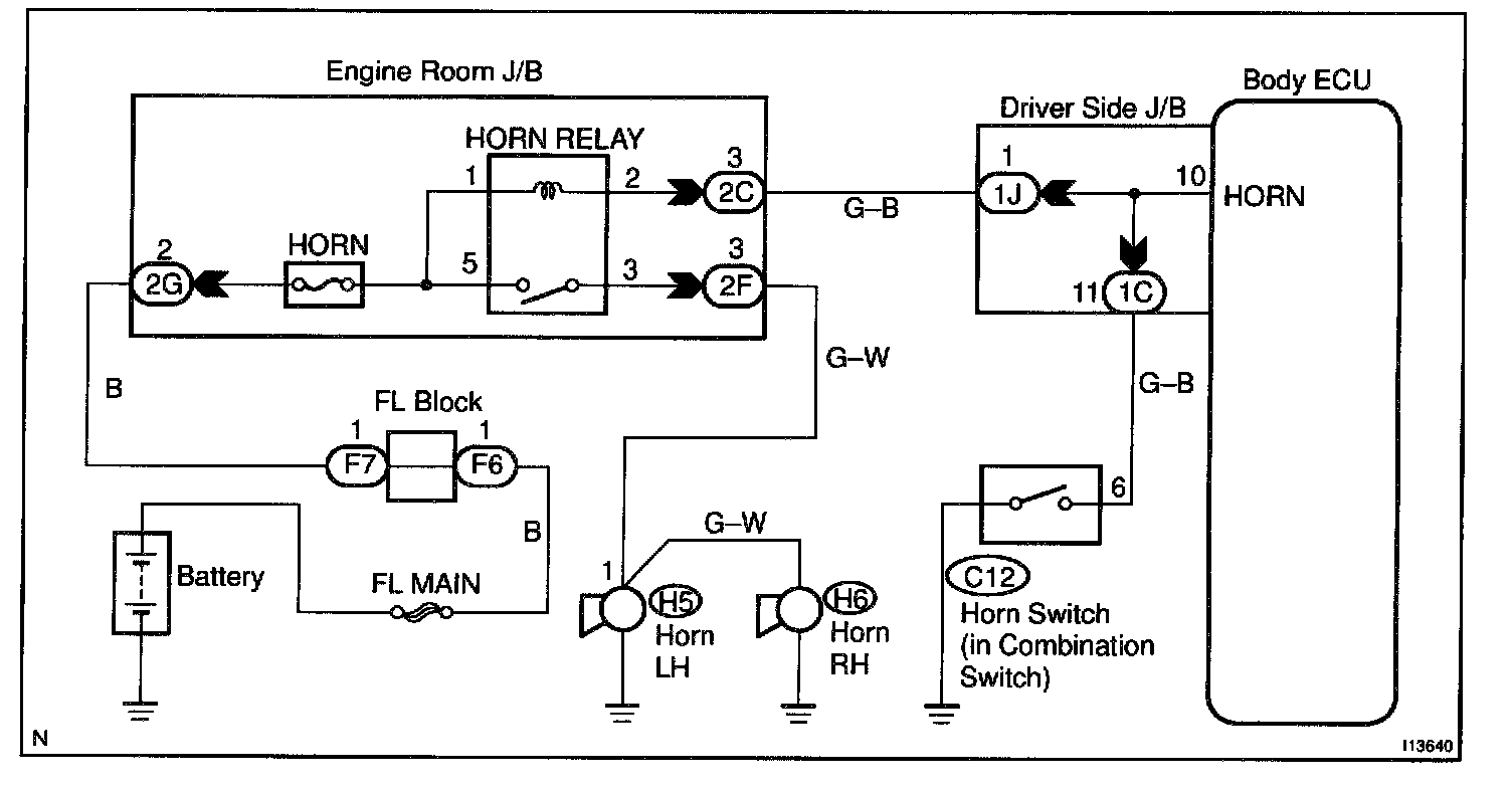 The horn is connected to the body ECU and activated by the body ECU during warning of the theft deterrent system.