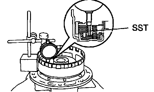 b. Install a dial indicator and measuring terminal Special Service Tool (SST) together, measure the direct clutch piston stroke while applying and releasing compressed air (392 - 785 kPa, 4 8 kgf/cm2, 57 - 114 psi).