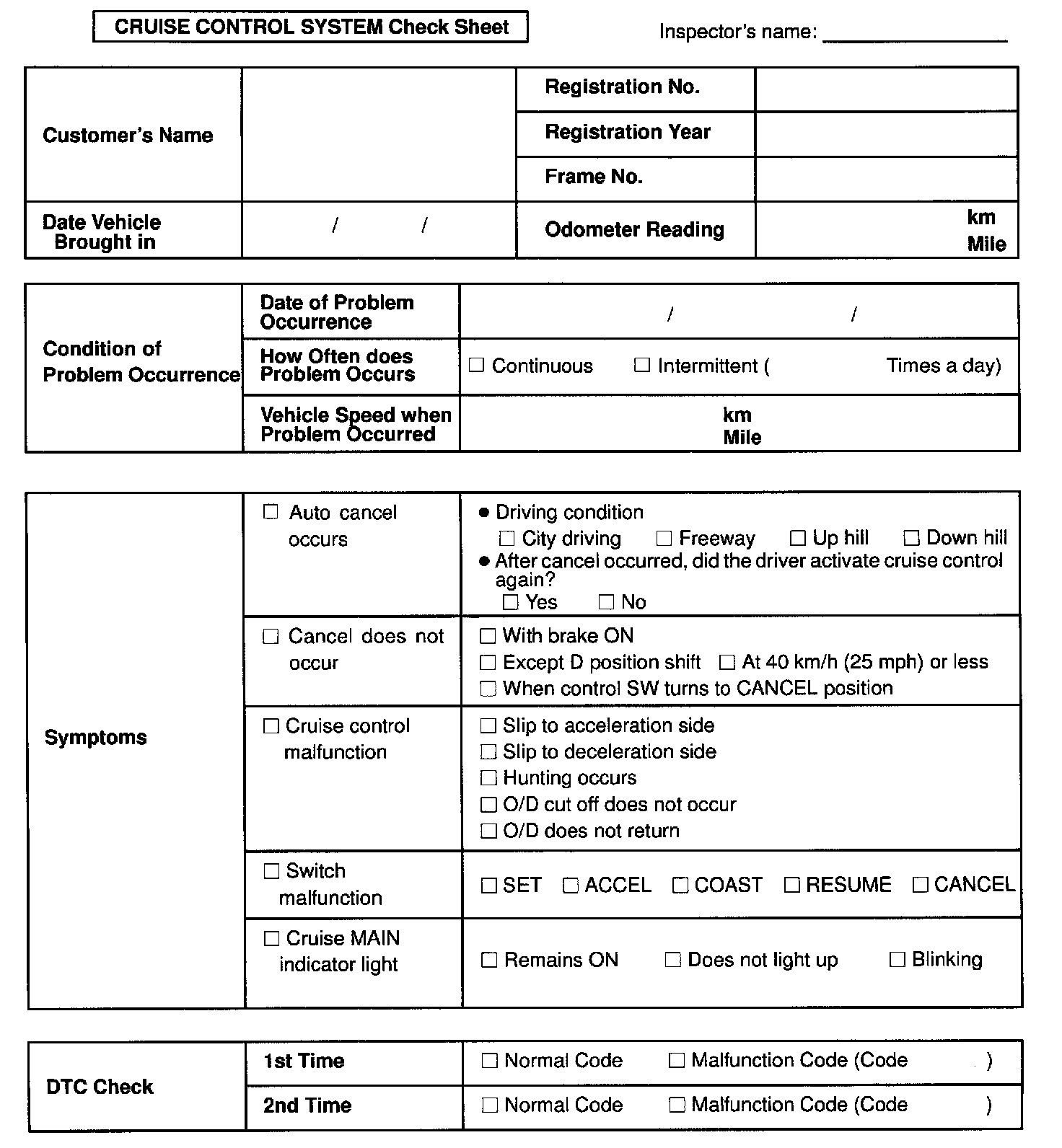 Cruise Control System Check Sheet: