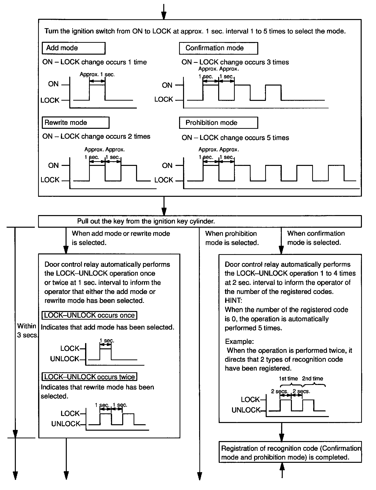 - The add mode is used to retain codes already registered while you register new recognition codes. This mode is used when adding a transmitter. However, if the number of registered codes exceeds 4 codes, previously registered codes are correspondingly erased in order, starting from the first registered code.
