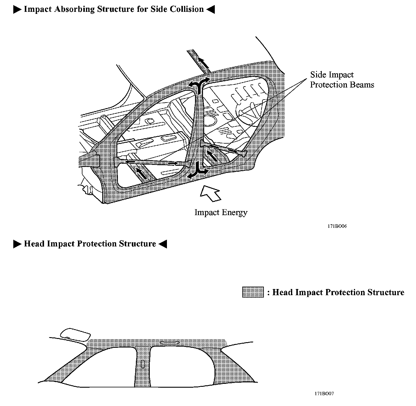 Impact energy of a side collision directed to the cabin area is dispersed throughout the body via pillar reinforcements, side impact protection beams, floor cross members, etc. This dispersion of energy keeps the energy directed to the cabin to minimum level. In addition, the body is made highly rigid through reinforced joints and the use of high strength sheet steel in order to maintain the maximum preservation of the cabin space. And, in order to make the door energy absorbent, a closed cross section configuration is provided at the belt line area of the front and rear doors.