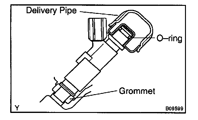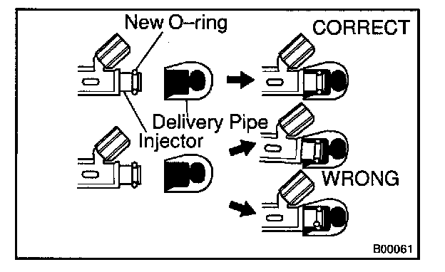 c. Install the injector to the delivery pipe and cylinder head, as shown in the illustration. Before in installing the injector, must apply spindle oil or gasoline on the place where a delivery pipe or a cylinder head touches on O-ring or grommet of the injector.