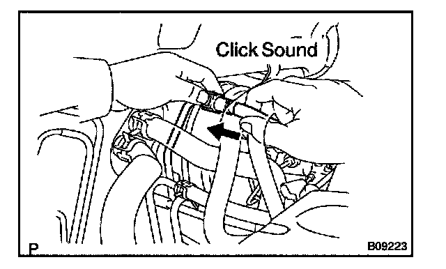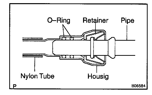 4. Match the axis of the connector with axis of the pipe, and push in the connector until retainer makes a "click" sound. In case that the connections is tight, apply little amount of new engine oil on the tip of the pipe.