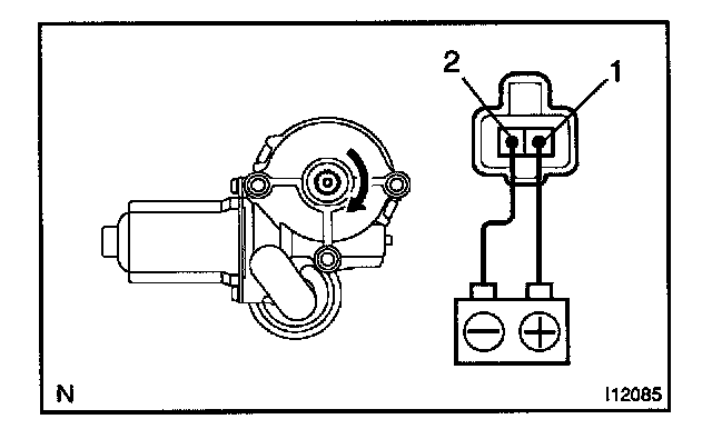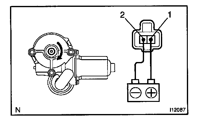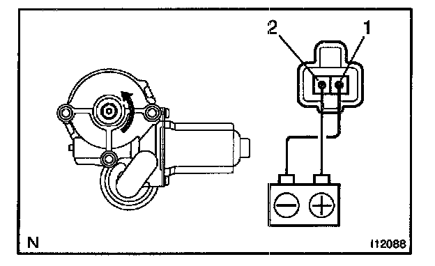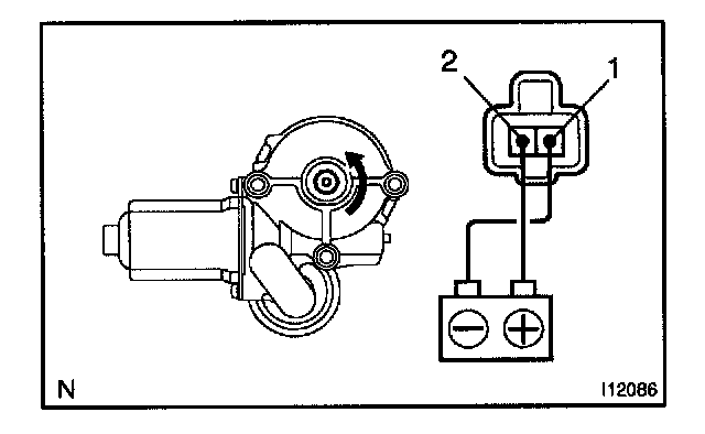 a. Connect the positive (+) lead from the battery to terminal 1 and the negative (-) lead to terminal 2, and check that the motor turns clockwise.