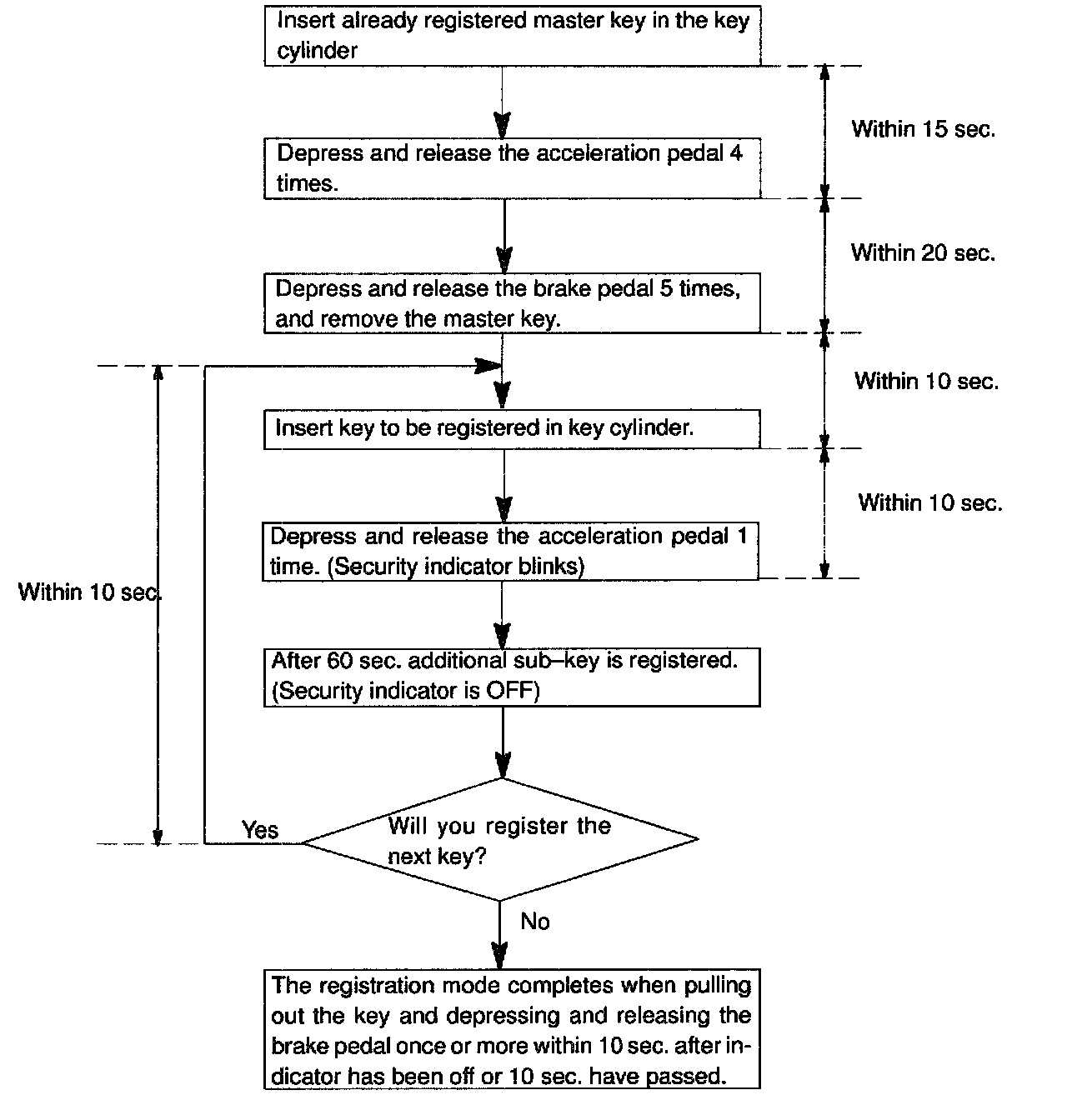 HINT: In case of having lost all the already registered master keys, you are not able to do additional registration or deletion. Change the ECM and then must register the new key codes according to the following registration procedure of the automatic registration mode.