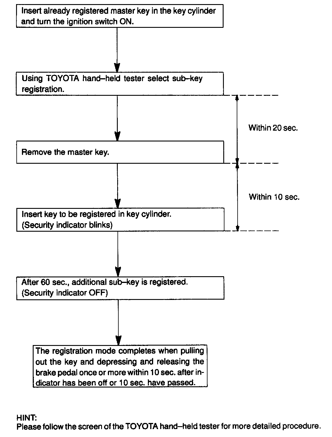 There are 2 ways for registration of additional master key, one way is depressing brake pedal and acceleration pedal and the other way is using TOYOTA hand-held tester.