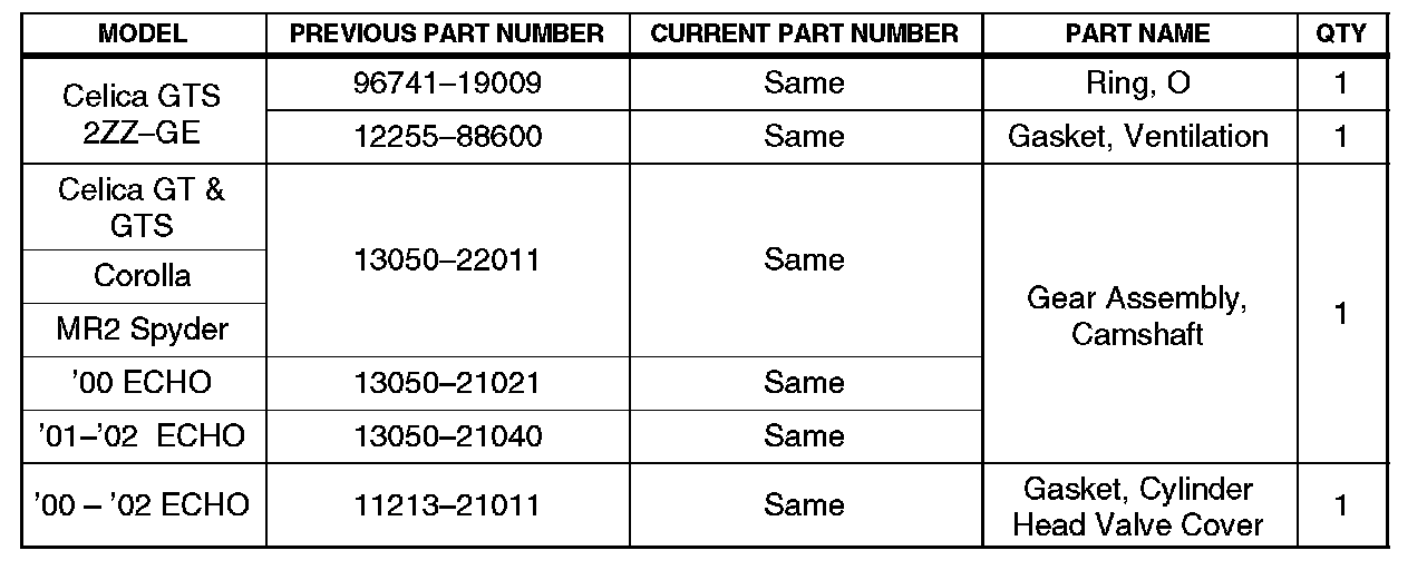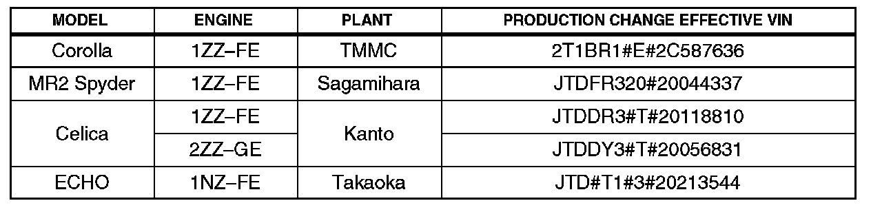 ^ 2000 - 2002 model year Corolla, Celica, MR2 Spyder, and ECHO vehicles produced BEFORE the Production Change Effective VINs shown below.