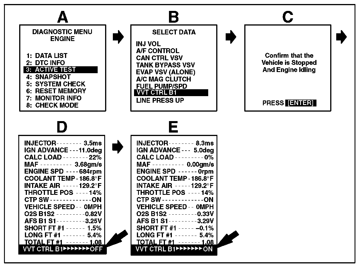 3. Referring to the screen flow, connect the Toyota Diagnostic Tester to the vehicle and select the VVT Control Bank One Active Test (VVT CTRL Bi) from the Active Test Menu.